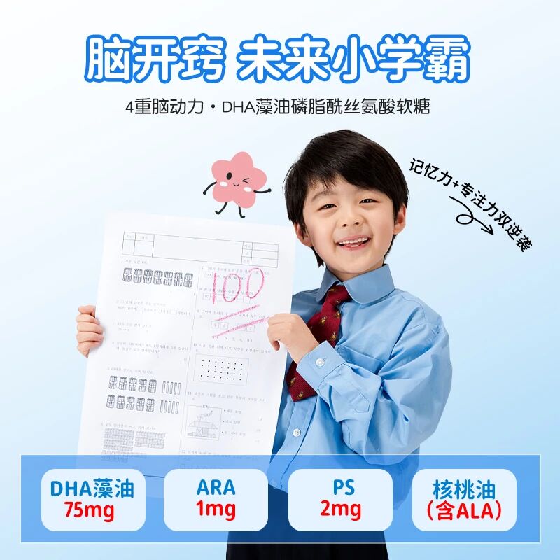 DHA、ARA、PS(磷脂酰絲氨酸)和ALA被稱為“腦黃金組合”,優(yōu)卡丹DHA藻油磷脂酰絲氨酸軟糖每粒含75mg DHA藻油+2mg PS+1mg ARA+ALA核桃油,4重腦動力孩子記憶力和專注力雙逆襲,在學(xué)習(xí)和生活中更加得心應(yīng)手,輕松開啟學(xué)霸模式。